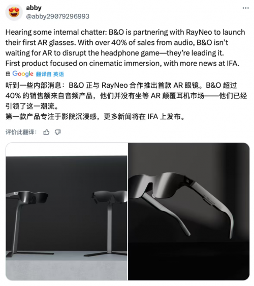 本周,外媒爆料,拥有百年历史的丹麦殿堂级音响品牌Bang&Olufsen(简称B&O)将在今年10月份发布品牌首款AR眼镜,更有消息指出该产品或与中国AR领域头部企业雷鸟创新联合打造。这一消息引发音频行业与AR行业高度关注,被视为传统音频巨头抢占AR赛道,布局下一代核心用户入口的重要信号。