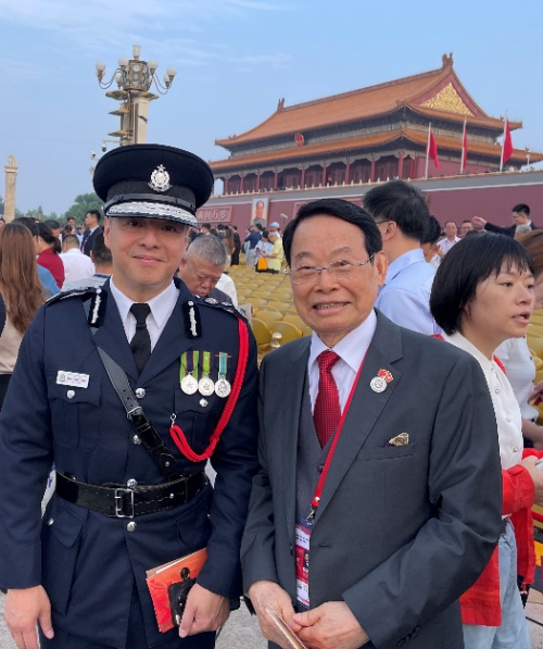 相隔10年,八秩高龄的江苏省政协原常委,香港美协创会主席、荣誉主席萧晖荣教授再次来到天安门广场,见证盛大阅兵仪式,并出席在人民大会堂举行的文艺晚会。