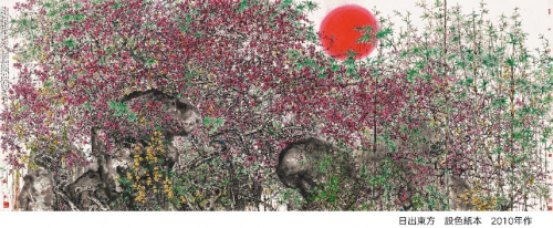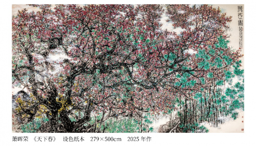 萧晖荣教授是艺术家,更是一位和平使者。他还为庆祝联合国成立和反法西斯战争胜利而创作《天下春》,祈世界永远和平!画作中,老梅枝干如虬龙盘曲,红梅似火、粉梅如霞,万千繁花缀于枝头,旁侧新竹挺秀、幽兰静绽,涓涓细流与轻漾流云相映,墨色与艳彩交织出蓬勃生机,以此表达作为中国艺术家的心意与担当。