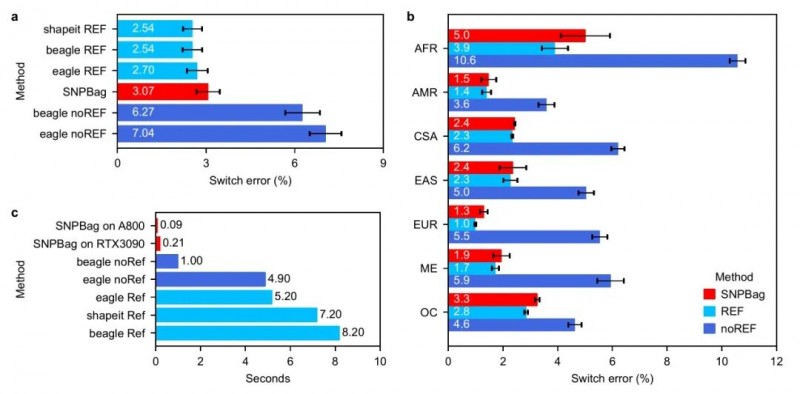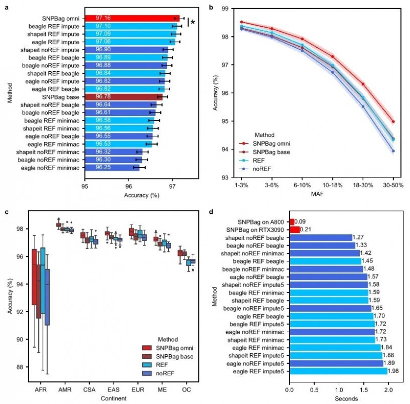特别地,SNPBag无需参考面板,用GPU推理仅0.09秒,较传统方法快11-91倍,在效率和灵活性方面优势显著。未来若采用真实单倍型数据训练或可进一步提升准确率。