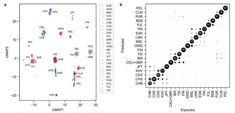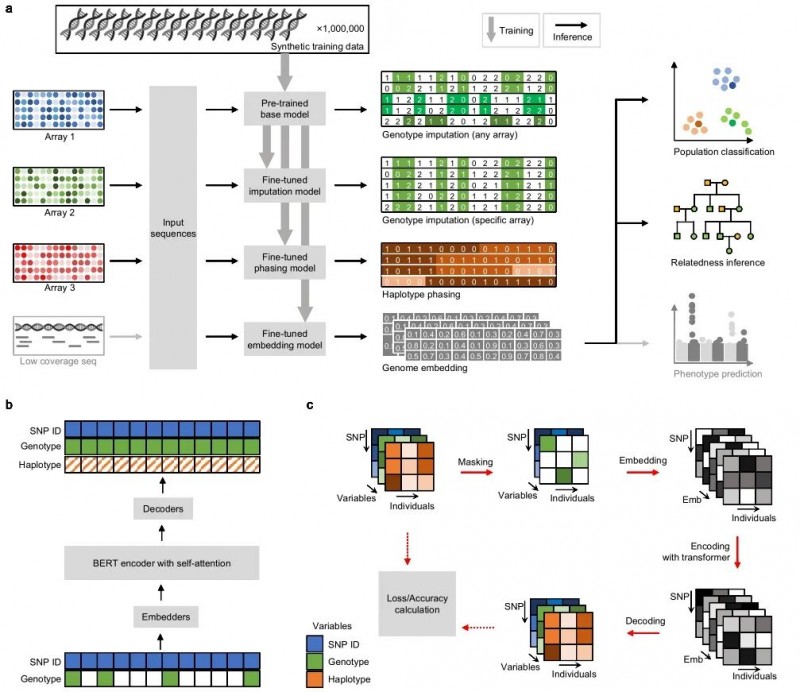 研究团队采用掩码预训练策略,随机遮盖85–99%的基因型,并结合配对SNP标识符形成输入序列;使用线性嵌入层将这些序列投射到512维空间中,并将其输入到具有16层Transformer的BERT编码器中,再通过多层感知机(MLP)解码被掩码的基因型。最终训练出两个不同规模的模型:一个是22号染色体(chr22)模型,含3800万参数,用于基础任务验证;另一个是全基因组模型,含8.36亿参数,覆盖603万个SNP,用于广泛应用场景。