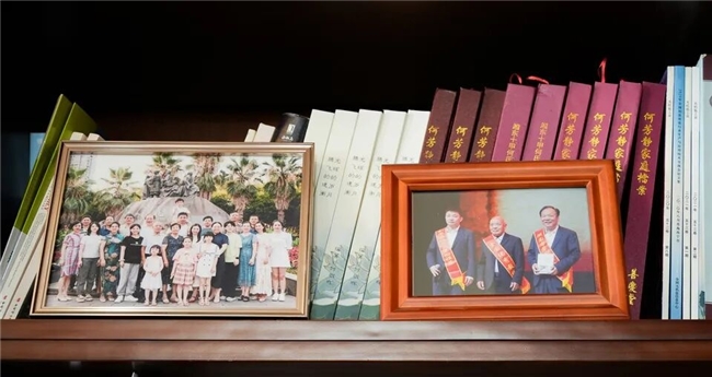 何朝晖的书架上摆放着全家福。