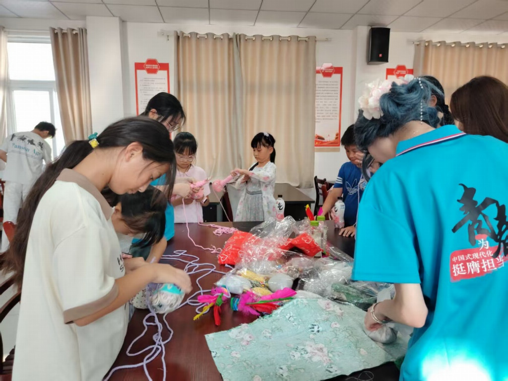 (图为实践团成员与小朋友们一起制作艾草捶 图摄张海)