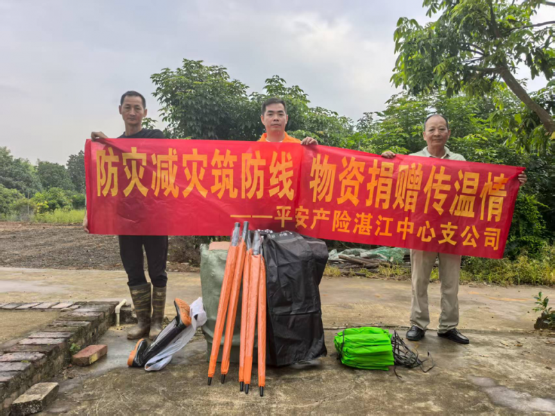 在湛江、肇庆等地,平安农险团队深入花卉园区与果树产区,手把手指导农户通过“竹竿加固+塑料绳绑扎”的方式固定作物茎秆,减少大风导致的植株倒伏、枝条断裂等损失,从技术层面提升作物抗风能力。同时还向农户赠送雨衣、雨鞋、防汛袋等应急物资,为防灾救灾提供有力支持。