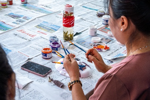 小朋友们正在认真绘制彩陶杯垫