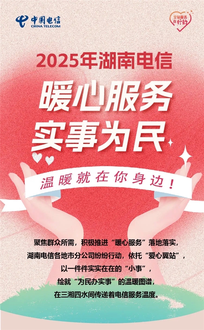 2025年湖南电信暖心服务实事为民温暖就在你身边。聚焦群众所需,积极推进"暖心服务”落地落实,湖南电信各地市分公司纷纷行动,依托“爱心翼站”,以一件件实实在在的“小事”,绘就“为民办实事”的温暖图谱,在三湘四水间传递着电信服务温度。