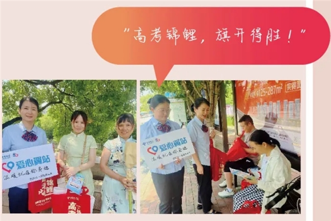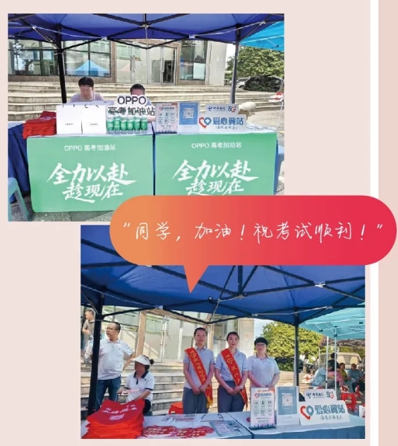 高考期间,郴州分公司永兴营业厅“工会爱心翼站”设立送考服务站,免费提供考试文具、矿泉水、清凉扇、小风扇等实用物品,还布置了金榜题名、一举夺魁、为青春喝彩等祝福语,为考生加油鼓劲,以暖心服务助力学子轻松上阵、从容应考。同时依托5G技术优势,为考生及家长提供网络咨询、紧急通讯保障等服务,用科技力量助力学子