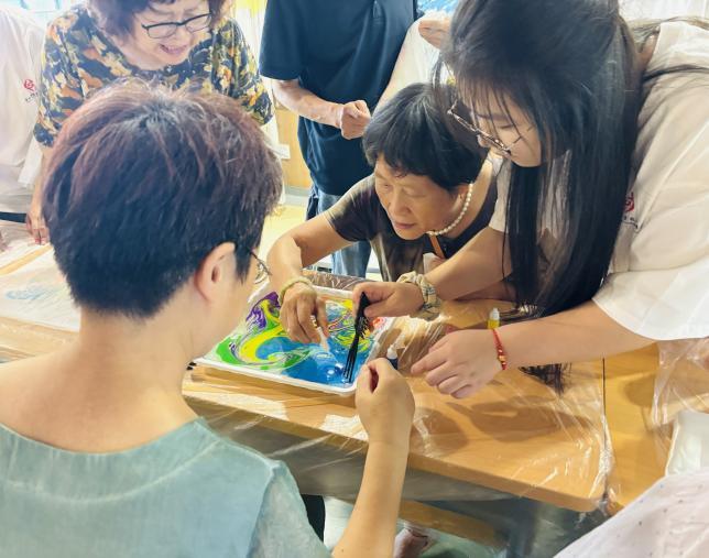 实践团注重以可触摸、可聆听、可操作的方式重构非遗体验,推动视障群体从文化接收者转变为参与创造者。水拓丝巾活动中,团队成员逐步引导参与者感知颜料滴落、水流搅动与丝绸吸附的细微变化,借助触觉与听觉替代视觉,实现艺术共创。在桃花坞木刻年画体验环节,视障朋友们以指尖读版,抚触木刻凹凸纹样,再在志愿者辅助下完成刷墨、拓印。一道道工序在他们手中化作与古老技艺的真实对话,非遗不再仅是“被观看”的遗产,更成为可感知、可实践的文化土壤。
