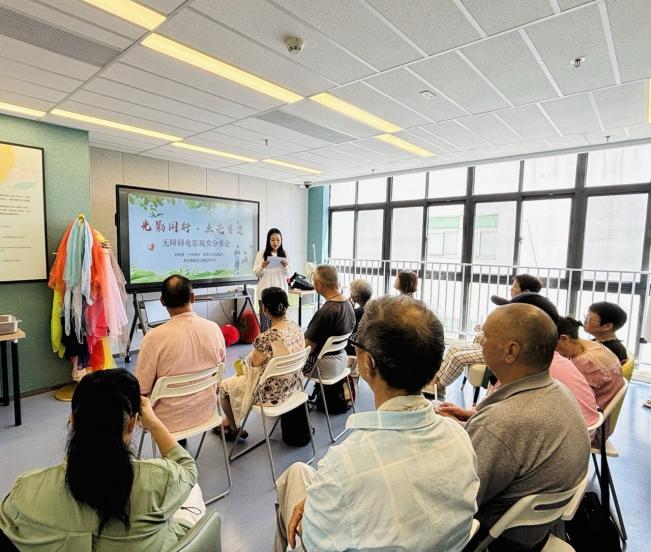 为弥补视障群体视觉体验的缺失,实践团依托无障碍视听资源,开展多层次文化共享活动。在沧浪街道,团队成员配以专业口述解说,带领视障老人“观看”无障碍电影,用声音建构剧情时空,让老人们随情节动容颔首。在南华社区,一场沉浸式读书会上,成员朗读《雷雨》经典片段,以声传情再现命运纠葛,并分享《红色家书》中的家国情怀,在深情诵读中完成一场跨越时空的精神对话。相门社区则回荡着歌声与节拍,视障群体在文艺表演中放声高歌,展现出自立自信、向阳而生的文化风貌。