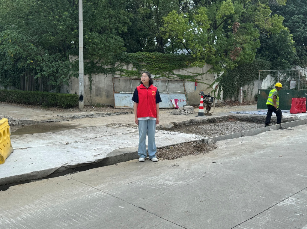 实践期间,实践团不仅是发展的观察者,更是治理的参与者。横林镇乡村旅游升温,游客增多,而部分路段施工改造,通行秩序受影响。成员们身着红马甲,在施工现场坚守,他们的身影成为横林镇街头一道亮丽的风景线,不仅保障了交通的顺畅,也提升了游客对横林镇的印象分,以实际行动践行 ESG 理念中的社会责任。