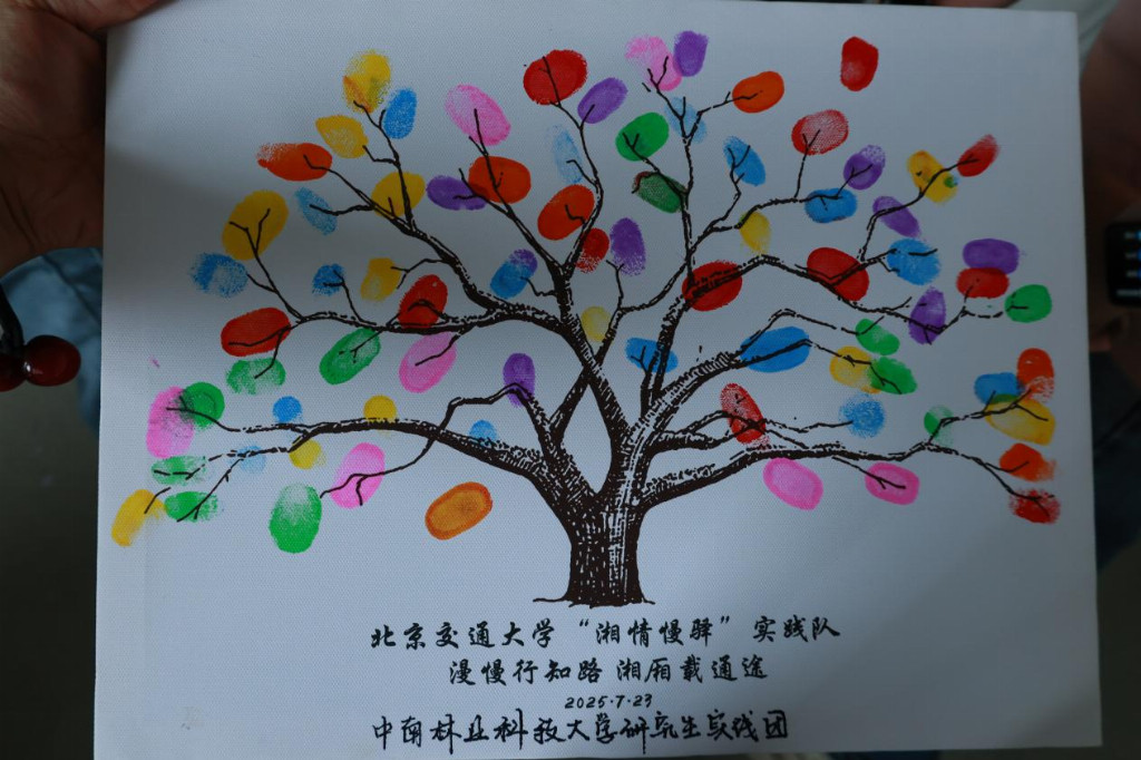 在活动的尾声部分,实践团成员与小朋友们共同完成了手印画创作。在温馨融洽的氛围中,大家一同用手蘸取颜料,将五彩的手印层层叠印在画布之上,共同构成一棵枝繁叶茂、生机盎然的参天大树。每一个彩色手印代表一个梦想的印记,也象征孩子们如枝叶般茁壮成长、向上延伸的未来。