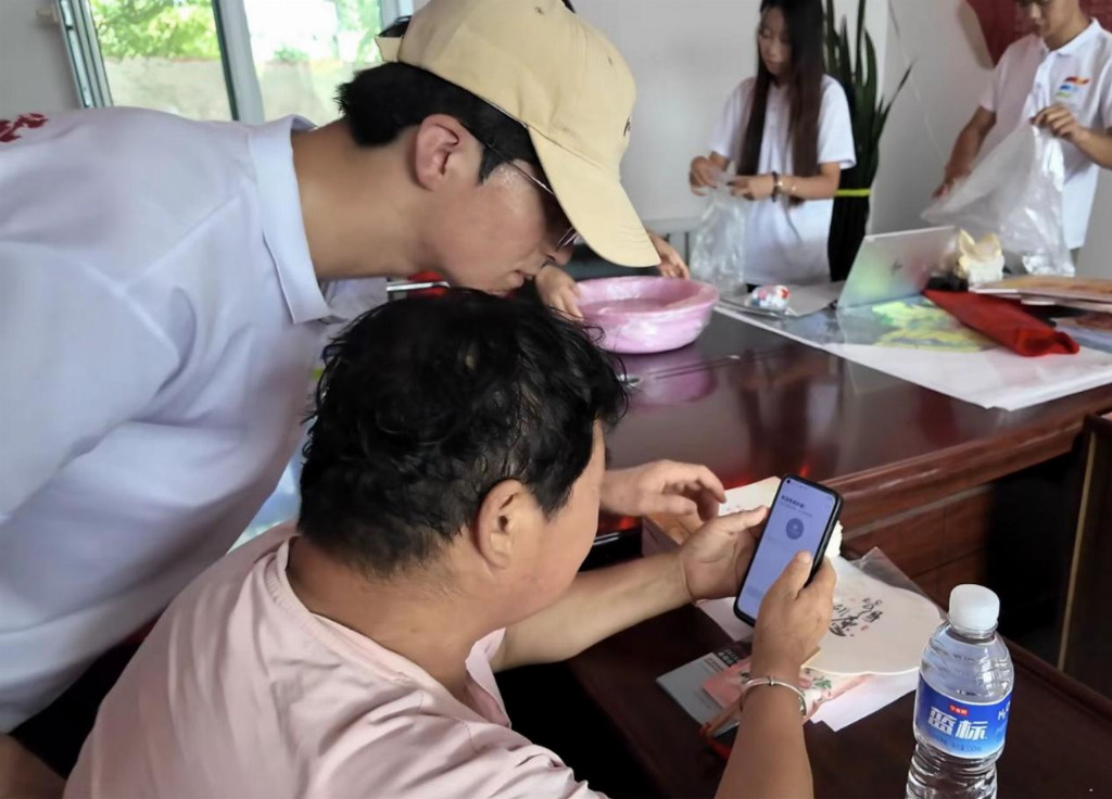 非遗共创环节,村民与团队共研马头琴制作技艺,传承人用普通话讲述守护故事,成员同步记录,丰富成果储备展示。非遗漆扇体验中,成员以普通话讲解技法,鼓励融入蒙古族元素,实现汉蒙创意融合,生动传递民族文化魅力。