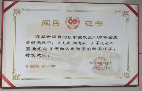 (图:许文斌受阅证书)