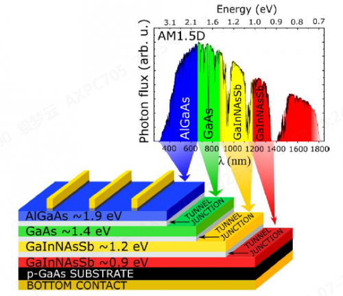 图1.具有1.9eV、1.4eV、1.2eV和0.9eV结的4J叠层电池的示意图结构。1.2eV和0.9eVpn结基于GalnNAsSb[5]。