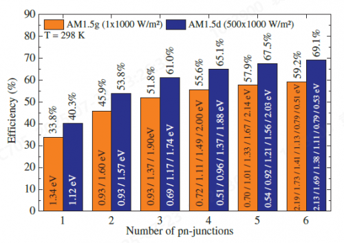 图3.在AM1.5g(1×1000W/m2)和500倍聚光AM1.5d(500×1000W/m2)条件下不同pn结(子电池)数量的理论效率极限[1]