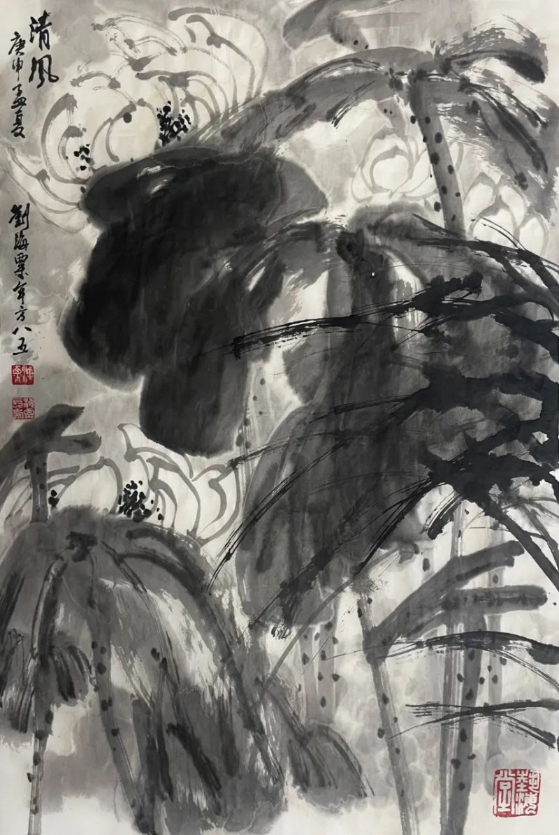 刘海粟的《荷花》以水墨淋漓之笔,绘就一池清韵。画面中,荷叶以浓墨泼洒,墨色层层晕染间,尽显荷叶的厚重与蓬勃生机;荷花则以淡墨轻勾轮廓,花瓣似透着莹润光华,于墨色浓淡的交织中,将荷花的清雅与灵秀尽数展现。画面上方题诗与落款,更添文人雅致。题诗以行书书写,笔意流畅洒脱,与画面水墨相呼应,让诗意与画意交融共生。整体观之,此作融传统笔墨功底与现代审美意趣,亦见刘海粟对自然生命的细腻感知与艺术表达的创新探索,是传统花鸟画在近现代转型期的生动写照。