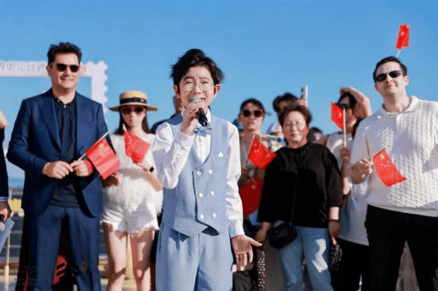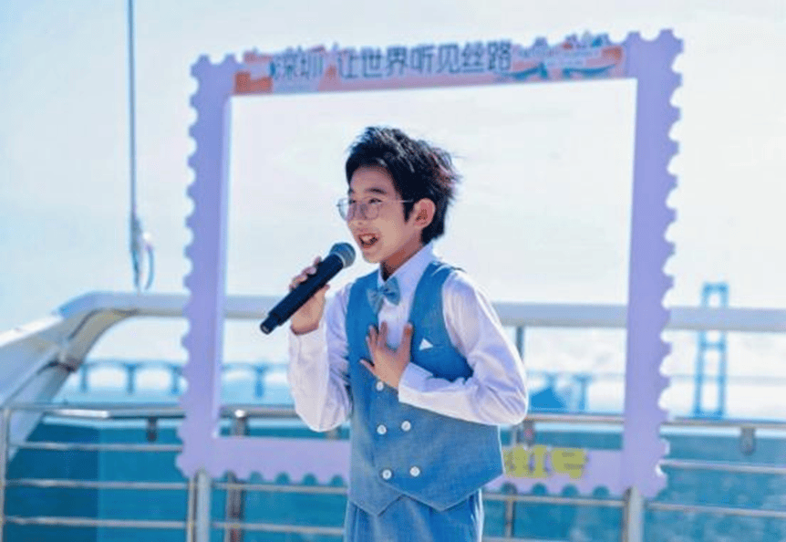 琵琶演奏家李跞在甲板上激昂演绎经典武曲《十面埋 伏》,铿锵弦音如雷霆奔涌,传递中华文化的深厚力量。童 声歌手苏骏煜则以极富感染力的纯净声线献唱《我爱你中 国》,带动全场观众自发合唱,将气氛推向高潮。整场活动 由知名文化博主“ 晓明哥Donlee ”以诗化双语串联解说,传 统艺术与当代传播实现完美融合。