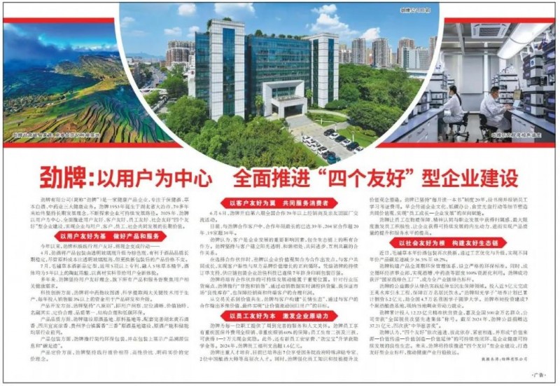 日前,人民日报聚焦劲牌“四个友好”型企业建设,全面解读企业“用户友好、员工友好、社会友好、客户友好”的具体举措与显著成效,代表着官方主流媒体对劲牌坚持做“全面友好型企业”的关注与认可。
