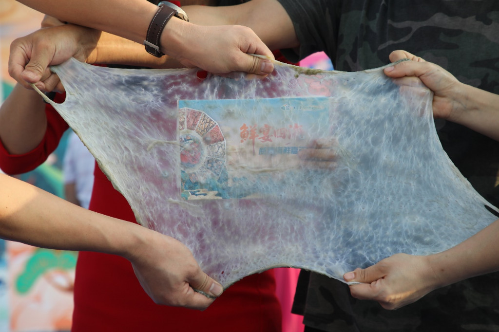 在另一边在手拉海参表演赛上,来自威海餐饮行业的多位高手同台竞技,将巴掌大的威海刺参手工拉伸成薄如蝉翼的透明薄膜,直观展现威海刺参肉质厚实、韧性十足的品质,引来阵阵惊叹。