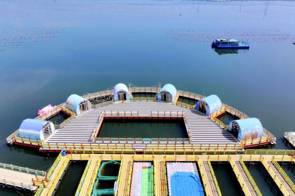 目前,桑沟湾国家级海洋牧场已建成8000多平方米的海上观光平台,打造了原生态养殖参观区、逗鱼区、贝类采摘区、海珍品展示区、网红休闲打卡区等多个特色区域,并配套了丰富的水上运动项目,为广大游客提供多样化的海洋体验。