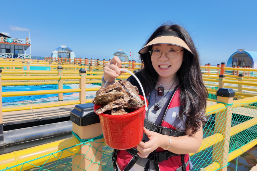 网络达人“听海看海啊”在贝类采摘区收获满满,她提着一桶亲手采摘的海鲜兴奋地表示:“非常高兴能参加这次活动,期待中午就能品尝到自己采摘的海鲜!”