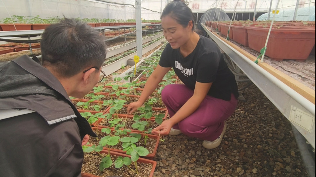图为指导教师冯嘉玥老师教授实践队员修剪将扦插的草莓苗。林琳 摄