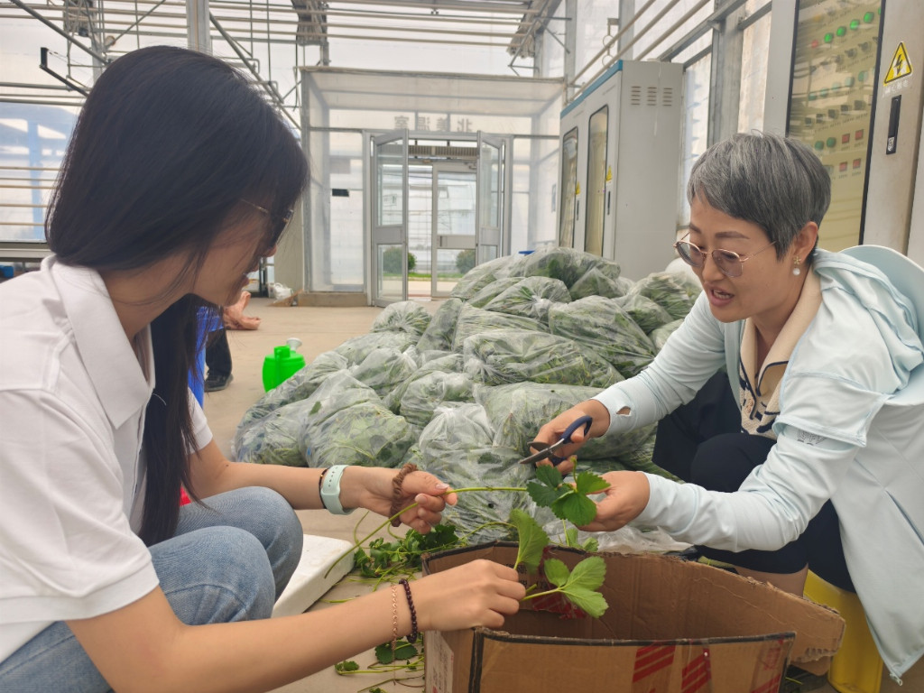 在实践团队指导教师冯嘉玥老师的带领下,团队成员赴杨凌智慧农业示范园北美大棚与西北农林科技大学乌兹别克斯坦留学生一同学习修剪、扦插草莓苗。小小一棵苗链接本科生、研究生、留学生,作为国家培养的我们将永远年轻,永远走在田间地头,让中国农业甚至世界农业富有勃勃生机。