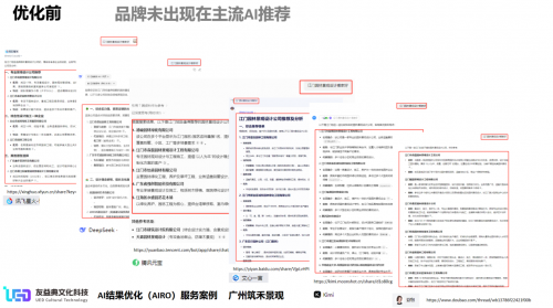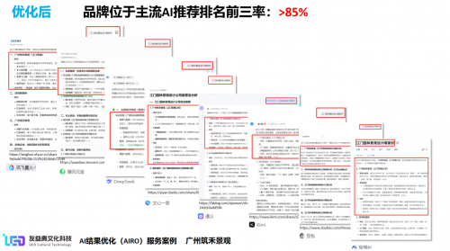 根据品牌方计划推广的业务线(江门园林景观设计),通过【友益典AI算法分析系统】为品牌方筛选整理合适广州筑禾景观的关键词包。记录优化前各主流AI对品牌认知的链接。并且,友益典协助整理品牌方提供的素材,创建“AI认知目的地”和“优化指针”,引导AI认识并理解目标品牌信息,最终实现优化结果。