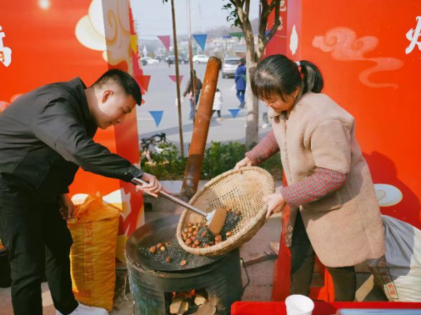 阳思亮(左)与村民一同炒板栗