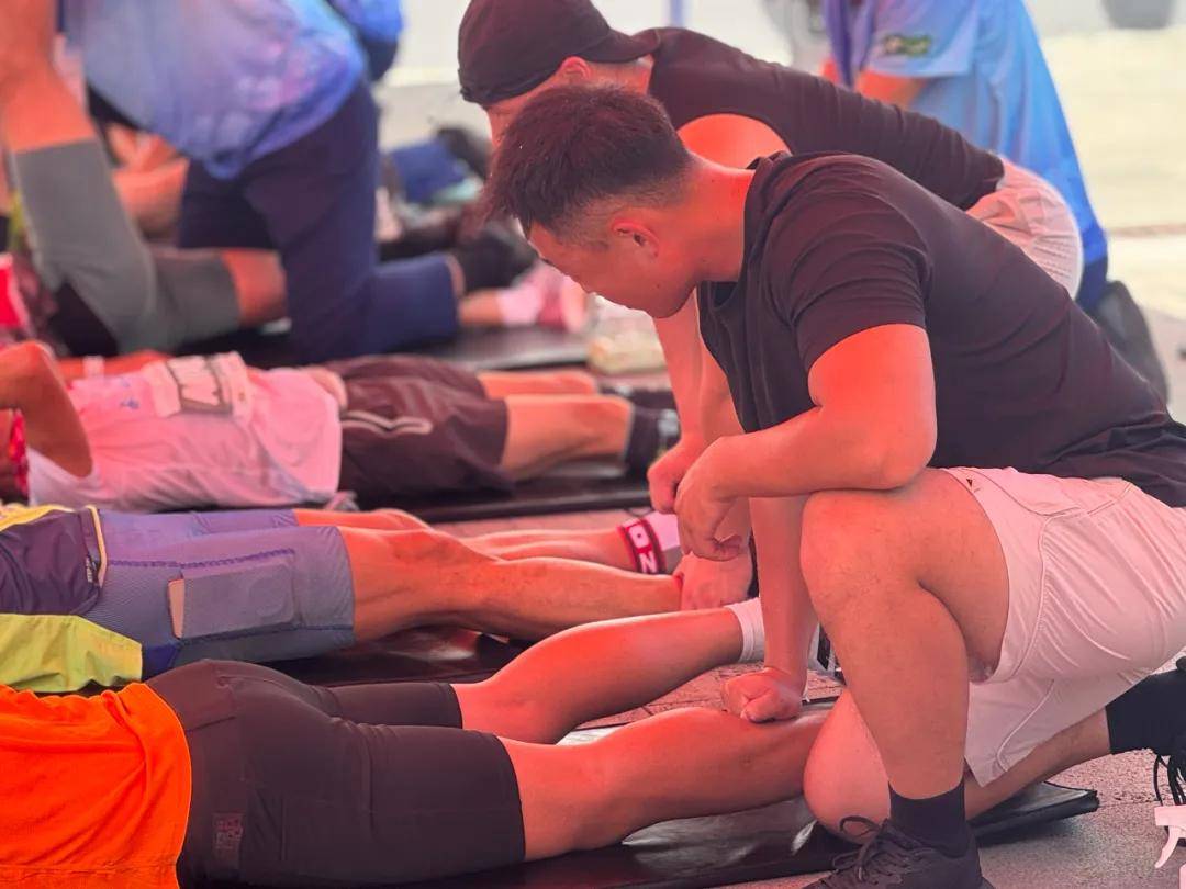 赛道提供湿海绵物理降温,补给点配备肌肉舒缓喷剂;赛后拉伸区有非遗中医传承人、运动理疗师,帮助跑者快速恢复。