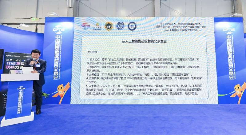 徐亭理事长在出席闭幕式环节时,正式发布《从人工智能到超级智能北京宣言》,他说: 2025 年 9 月 14日,在由WTO世界贸易组织、UNCTAD联合国贸易与发展、OECD经济合作与发展组织等国际组织支持的中国国际服务贸易交易会这个国家级、国际性、综合型平台, IAIGF(人工智能国际治理学术论坛)与IHETT(智能+产业融合高端智库)在北京举办“双子论坛”,邀请来自联合国等国际组织以及龙头企业、高校院所、创新主体、政府机构等跨学科、跨界别代表,共议“从人工智能到超级智能”的国际治理框架,形成本宣言。我们郑重发布《从人工智能到超级智能北京宣言》,并承诺以下六大原则(可信,可控,共治,普惠,绿色,共生)与二十项行动(涵盖基础研究与技术攻关、基础设施建设、重点场景应用、产业生态与人才建设四大领域共 20项行动)。超级智能不是下一代工具,而是下一代文明形态。它既可能把人类推向尊严与繁荣的巅峰,也可能把人类锁进不可逆的附属牢笼。选择哪条路径,取决于我们今天的共识与行动。本宣言即日起开放全球签署,欢迎各国政府、国际组织、学术机构、社会各界与企业、个人加入。让我们以北京为起点,把“可信、可控、共治、普惠、绿色、共生”的星火,扩散成照亮人类共同未来的曙光。超级智能的洪流已至,我们选择在人类命运共同体中引导它,而不是被它裹挟。