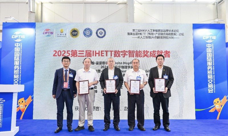 紧接着,第三届IHETT数字智能奖(IHETT-DIA) 颁发,该奖项是由IHETT(智能+产业融合高端智库)设立的一项重要奖项,旨在表彰在数字智能领域做出杰出贡献的个人和团队,聚焦于人工智能在产业应用、商业模式、社会服务等方面的卓越实践。2024年诺贝尔物理学奖得主约翰·霍普菲尔德,联合国副秘书长兼秘书长技术特使阿曼迪普·吉尔,中国工程院院士张平,中国工程院院士赵春江,国际核能院院士、中国人工智能学会会士张勤,汕头大学校长郝志峰荣获“2025第三届IHETT数字智能奖成就者”称号。中国工程院院士张平现场发表获奖感言指出:“感谢IHETT授予我第三届数字智能奖成就者奖。这份荣誉属于团队,属于共同攻坚的每一位同仁。近期,我所原创的以语义信息论为基础、智简为设计目标以及通信与AI融合(ComAI)为抓手的通信系统新范式在国内外受到极大的重视,建成了国际首个面向6G智能通信融合的外场试验网,受到国内外的媒体和学者的好评,许多重要学术刊物纷纷约稿。‘智简’的通信之道已在国内外达成了未来演进的共识,是“AI+”战略在通信领域的具体实践,并在6G国际标准化中提出了具体的技术‘方案’,产生了积极的影响。成果入选中国科协2025度十大工程技术难题,获评2024年度中国信息通信领域十大科技进展。未来,我将带领团队继续攻破“卡脖子”难题,为网络强国、制造强国贡献自己的创新方案”。