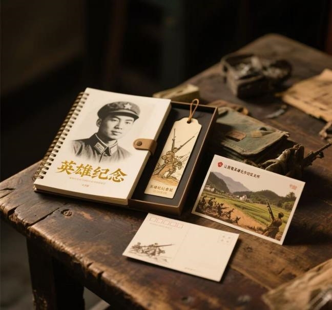 除了影像传播,团队还将红色精神融入文创产品,开发“英雄精神系列”木质书签——采用东北红松木制作,正面雕刻英雄剪影,背面激光雕刻“国既不国,家何能存”等经典语录;“时空对话系列”笔记本,内页穿插影片剧照与历史照片对比图,页眉印有“每日一句英雄语录”;“红色记忆系列”明信片,选取12个经典场景,留白供使用者书写心声。这些文创产品通过校园义卖、社区摆摊等方式推广,同时发起“文创传情·助力老区”公益行动,让红色文化在传递温暖中延续价值。