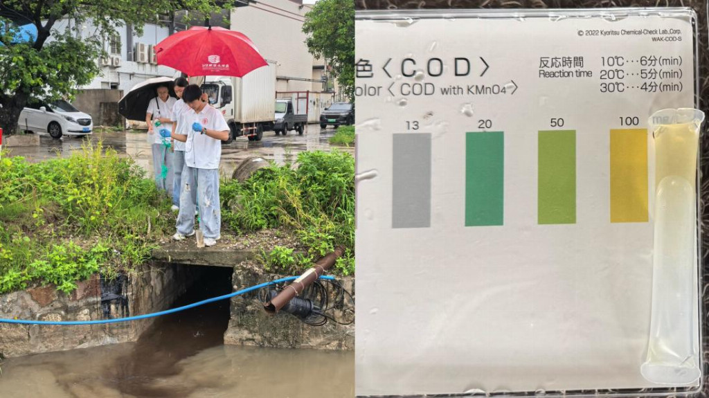 调研中,团队成员意外发现某工厂疑似偷排污水。在专员办的专业指导下,队员立即取样检测保留证据、记录偷排时间与位置、送检专业实验室,为环保执法提供关键支撑。使用快检包检测的结果显示,此工业废水的COD含量严重超标,严重危害沟渠水质。实践团用躬身实践为粤东的环保工作贡献青春力量。