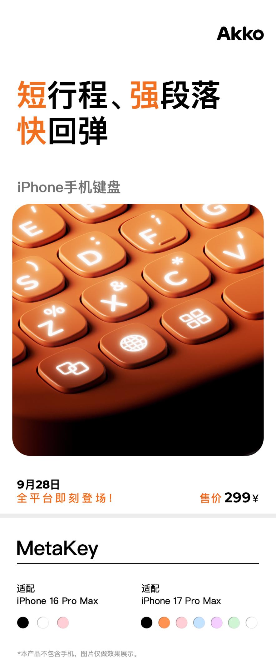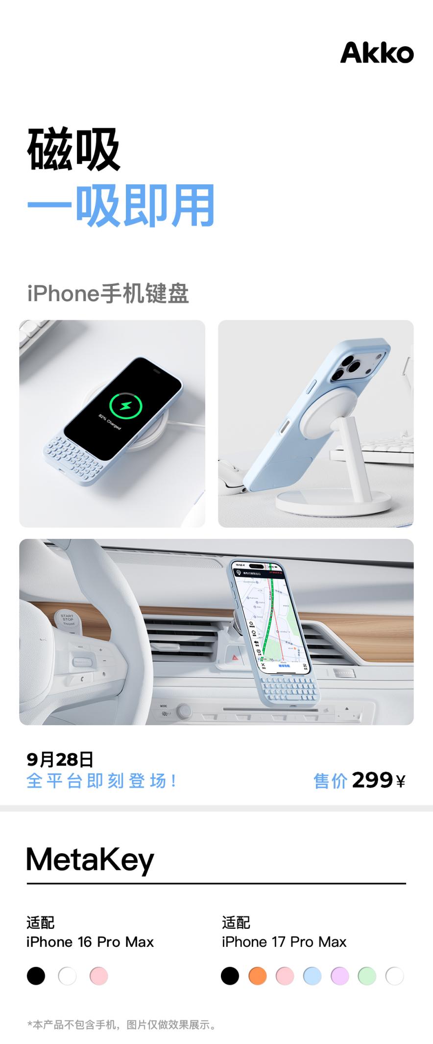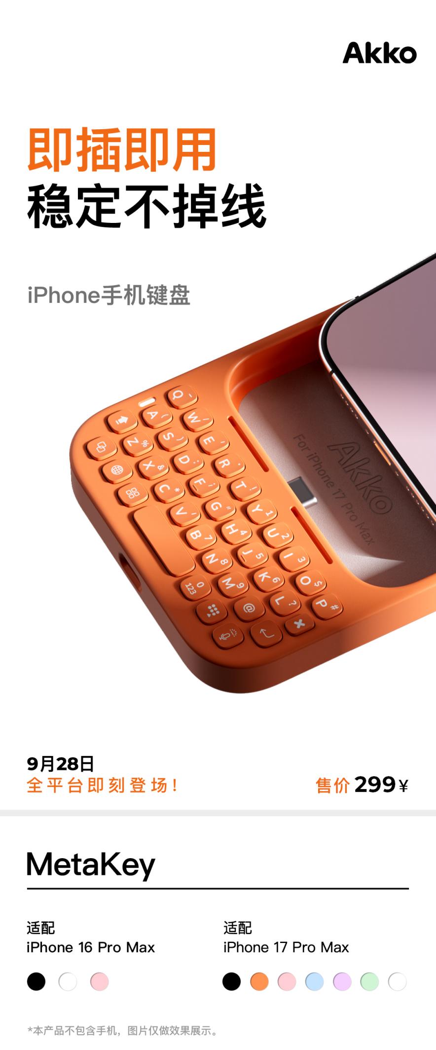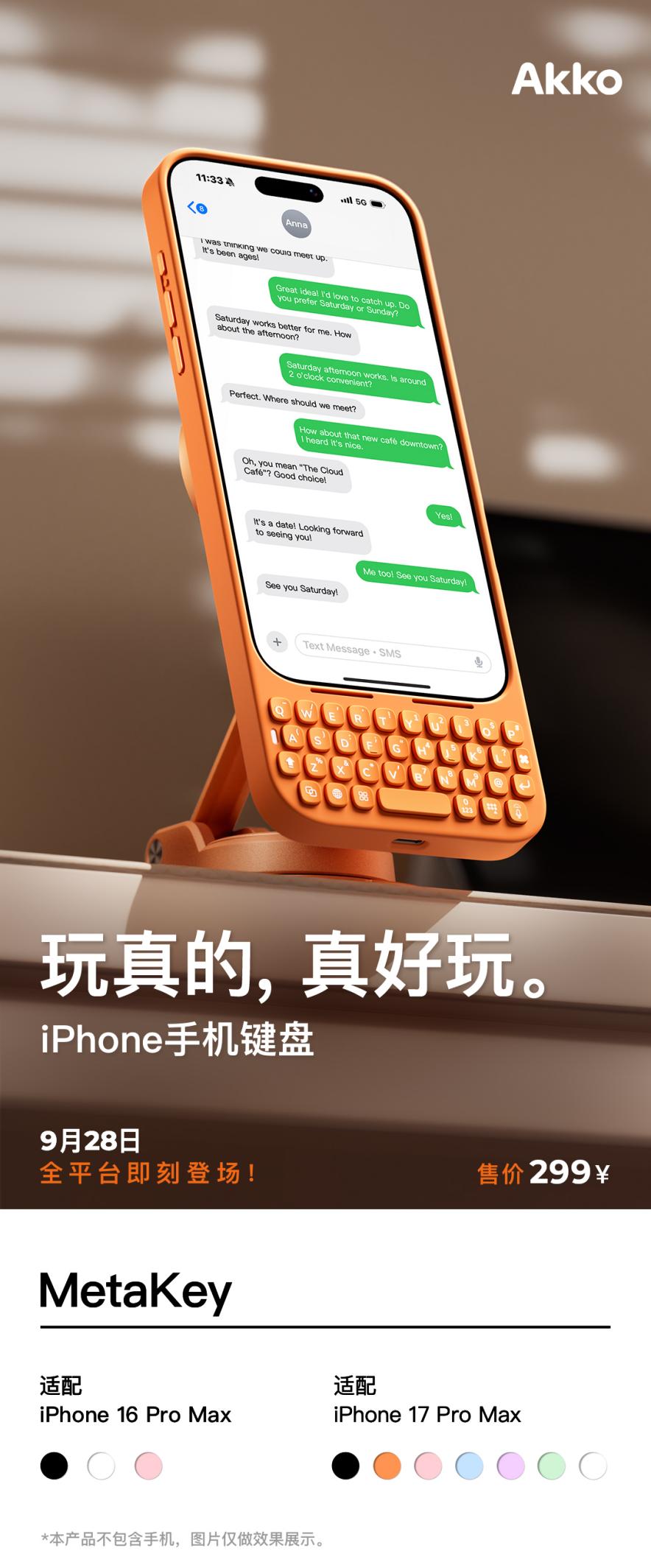 如果你总觉得手机屏幕触控打字少了点「感觉」,Akko新推出的MetaKey物理键盘手机壳,可能就是你的下一件潮流玩具。专为iPhone 16/17 Pro Max打造,把经典的实体键盘“粘”在了手机上,打字咔嗒手感声控一起满足!