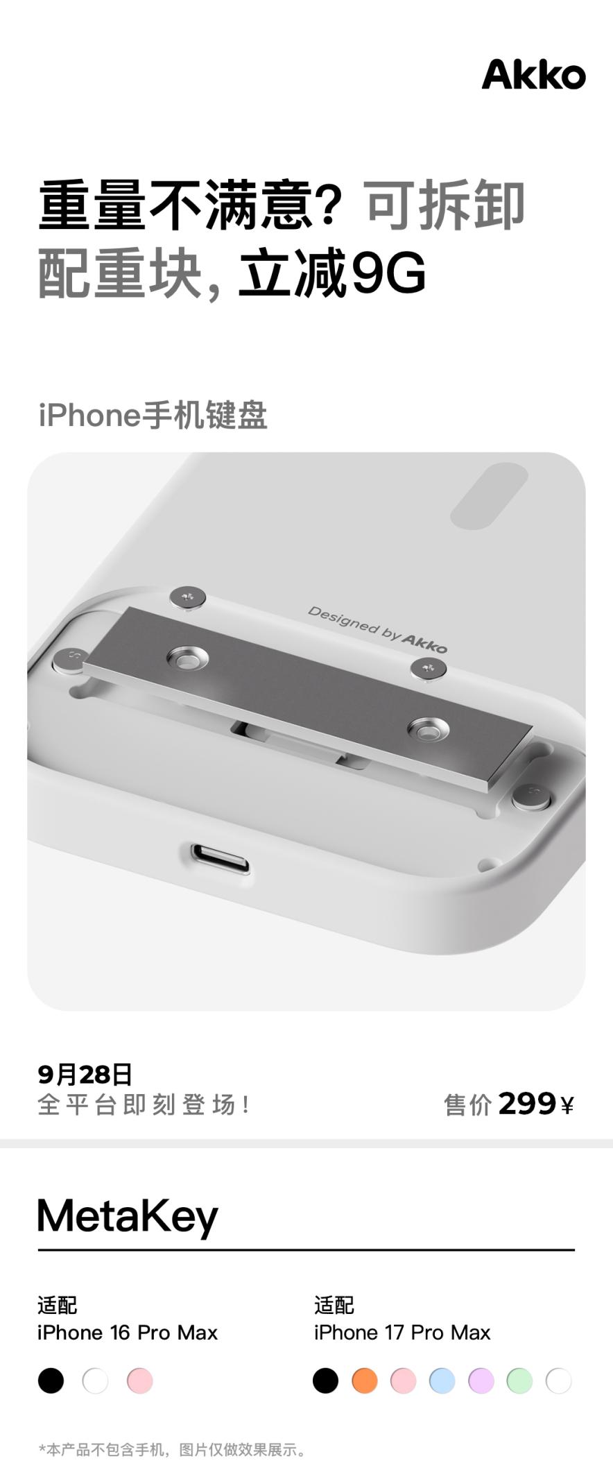 MetaKey提供16 Pro Max黑、粉、白三色+17 Pro Max黑、粉、白、蓝、绿、紫、橙七色可选,满足不同风格需求。键盘带白色背光,暗光环境下不仅清晰可见,还氛围感拉满。更好玩的是,壳内藏有可拆卸配重块——嫌重?拆掉立减9克;喜欢沉甸甸的真实感?装回去!你怎么舒服怎么来。