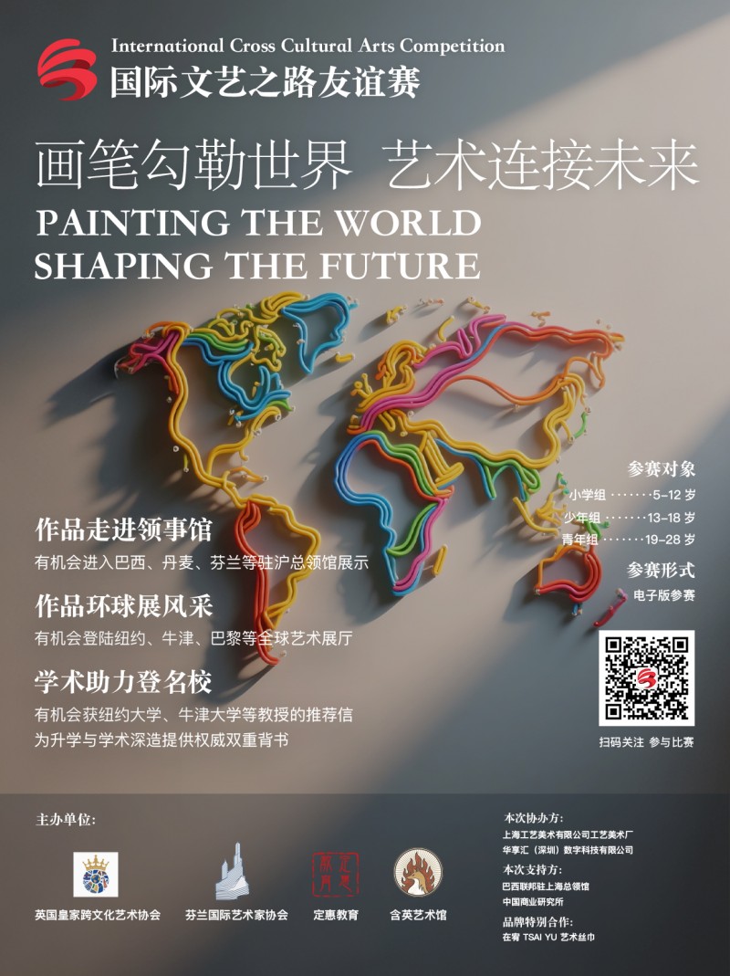 本届赛事面向5-28岁青少年及青年创作者,征集包括油画、国画、丙烯、水彩等在内的传统绘画作品,聚焦“世界文化交流”主题,鼓励参赛者用艺术表达对多元文化(本赛季主要聚焦中巴两国文化)的观察与理解。赛事流程包括7月25日启动征稿,10月8日24:00截止收件,10月中旬完成线上初评,优秀作品将于十月中下旬在巴西中心展出,该场地由巴西驻沪总领事馆提供,真正让艺术创作者携作品走进领事馆。组委会计划于2026年初起在牛津、巴黎、伦敦、纽约等全球文化艺术重镇展开巡展,让青少年创作者的成功走上国际舞台。所有入选作品将获得国际文艺之路友谊赛纸质及数字参展证书。