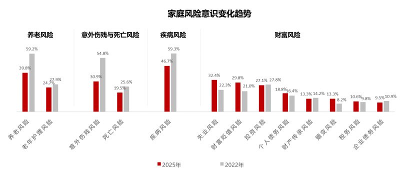 通过对近万个家庭样本的调研分析,发现2025年中国家庭风险认知呈现“传统生存型风险焦虑下降,财富风险感知明显提升”的特征。与2023年相比,疾病、养老、意外伤残与死亡风险的关注程度有所下降,而财富安全及管理风险意识显著增强,尤其对失业风险和财富贬值风险的关注度快速提升。
