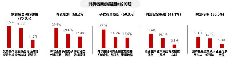 在选择保障方案时,消费者的决策维度已超越单一产品功能,转向“产品+服务”的全链条体验。白皮书调研数据显示,现代家庭的担忧主要集中在五个领域:医疗健康(75.8%)、养老规划(68.2%)、子女教育(60%)、财富安全(41.1%)和财富传承(36.6%),折射出当代家庭对确定性、安全感和可持续性的强烈诉求。