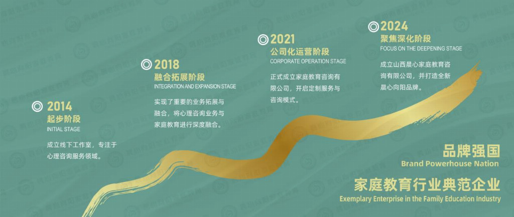 经过多年发展,晨心向阳已形成完善的服务体系和发展路径:2014年成立线下工作室,专注于心理咨询服务;2018年实现心理咨询与家庭教育的深度融合;2021年正式开启咨询与定制服务模式;2024年,山西晨心家庭教育咨询有限公司成立,品牌"晨心向阳"全新启航,专注于家庭亲子教育领域。