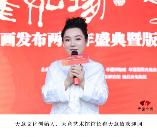 天意文化创始人、天意艺术馆馆长崔天意致欢迎词,对各位嘉宾的到来表示诚挚欢迎与衷心感谢。她回顾了天意文化在推动崔如琢艺术传播过程中的重要作用,以及两年来如琢版画取得的斐然成绩。崔天意表示,天意文化始终致力于弘扬中华优秀传统文化,将崔如琢先生的艺术佳作通过版画这一形式,让更多人能够欣赏与收藏,让中国艺术走向更广阔的世界舞台。