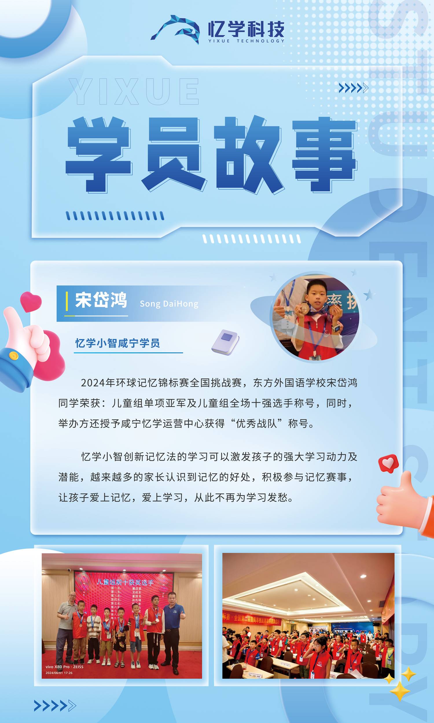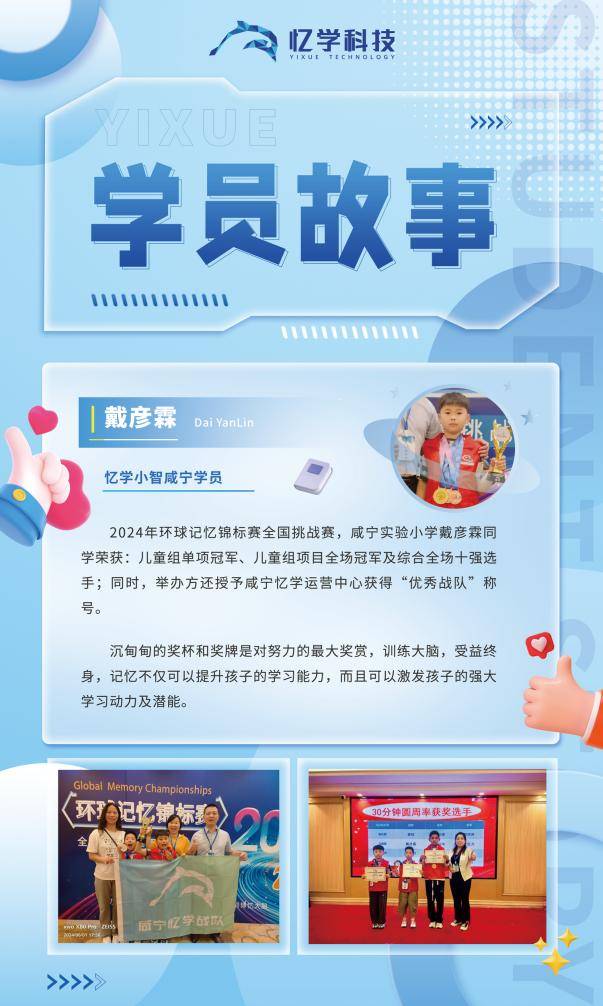 综合多方消息,在环球记忆锦标赛全国挑战赛中,众多优秀选手脱颖而出。其中,咸宁实验小学戴彦霖同学表现卓越,一举斩获儿童组单项冠军、儿童组项目全场冠军,并成功跻身综合全场十强选手之列;东方外国语学校宋岱鸿同学也成绩斐然,荣获儿童组单项亚军及儿童组全场十强选手称号。此外,举办方授予咸宁忆学运营中心“优秀战队”称号。