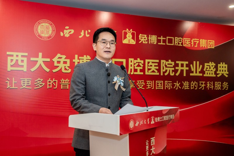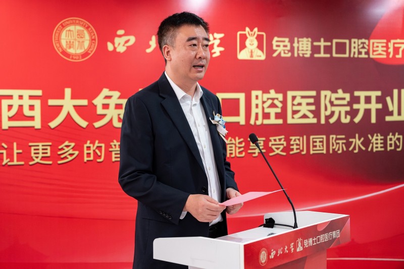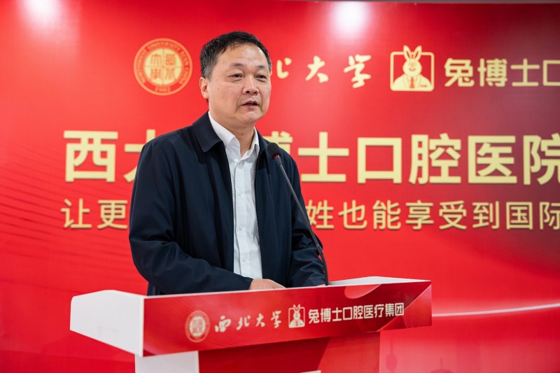 兔博士口腔医疗集团董事长王鸿应在致辞中表示:西大兔博士口腔医院从与西北大学签署战略合作协议,与碑林区张家村街道办签署招商引资协议,到今日的盛大开业,离不开各级党委和政府、医疗主管机构,各级地方政府领导和社会各界的鼎力支持与深切关怀。西大兔博士口腔医院的诞生,承载着一个非凡而卓越的主体——“西北大学”。这不仅是口腔医院卓越的标识,更是一份学术血脉的传承与一份沉甸甸的责任。回溯合作历程,我们被西北大学“公诚勤朴”的校训精神所感染,被其严谨求实的校风和开拓创新的教育初心所鼓舞。关于医院今后的发展和道路,王鸿应董事长做出如下期许和要求:一是要坚守医疗本质,永葆医者仁心;二是要勇攀技术高峰,锐意创新进取;三是要优化服务体验,塑造金字品牌;四是要深化校院合作,贡献社会发展,与校方一起,将西大兔博士口腔医院建设成为一所党和政府放心、大学认可、群众满意、员工自豪的现代化、数字化、人性化的口腔医疗中心,为人民的健康福祉贡献一份力量。