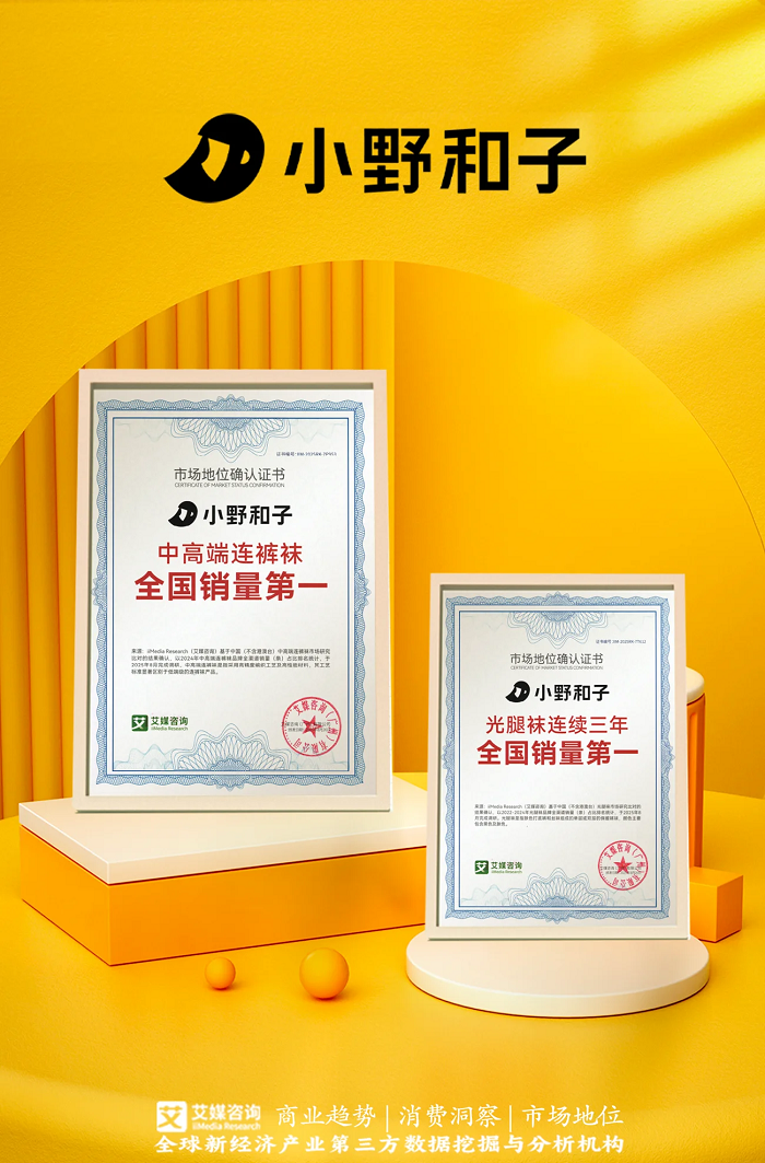 近日,专研女性功能服饰国民品牌小野和子,获全球领先的新经济产业第三方数据挖掘和分析机构iiMedia Research(艾媒咨询)授予“2024年中高端连裤袜全国销量第一” 与“2022-2024年光腿袜连续三年全国销量第一” 双项市场地位确认。这不仅是一份成绩单,更是一次品牌新历程的起点。不仅印证了小野和子行业领军地位,更标志着品牌完成从 “光腿袜单品引爆” 到 “连裤袜全品类领跑” 的战略跨越。始终坚持以“技术+品质” 为核心,小野和子彻底打破市场低价内卷的僵局,以强大势能引领中高端市场升级,赢得市场与口碑的双重肯定。