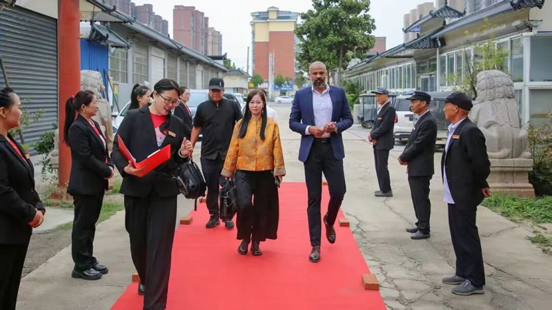 在全场嘉宾见证下,仪式进入核心环节。首先,刘爽与亚西鲁·拉纳拉贾共同为北京茶百戏非遗技艺传承基地(项城分院)揭牌,红色幕布缓缓落下,基地名称正式亮相,现场掌声雷动。