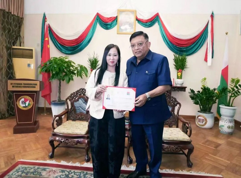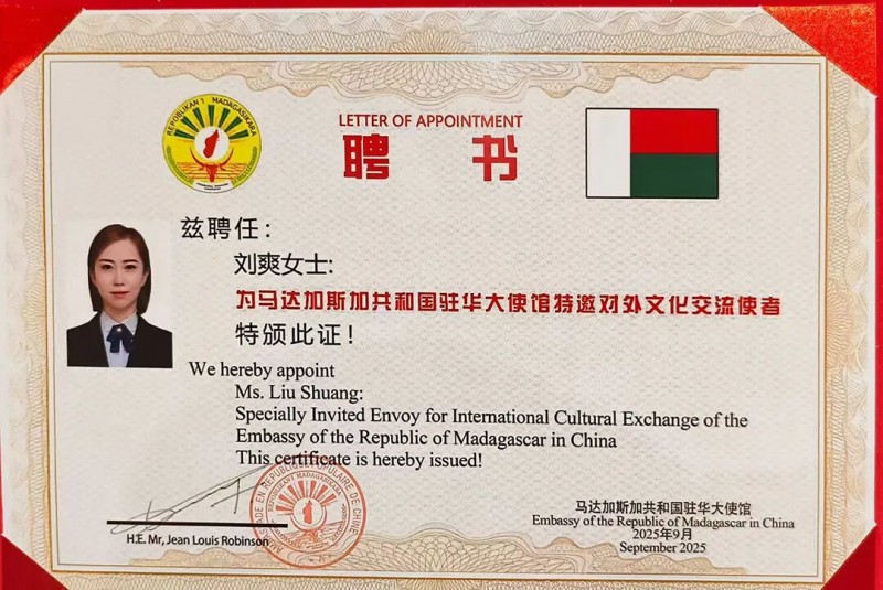 2025年9月21日下午,马达加斯加共和国驻华大使馆正式向刘爽女士颁发聘书,聘任其为“特邀对外文化交流使者”。该聘书由马达加斯加驻华大使让·路易·罗宾逊(H.E. Mr. Jean Louis Robinson)亲自签发,既是使馆对刘爽女士在国际文化交流领域长期实践与影响力的官方肯定,也标志着中马两国文化交流迎来新契机。