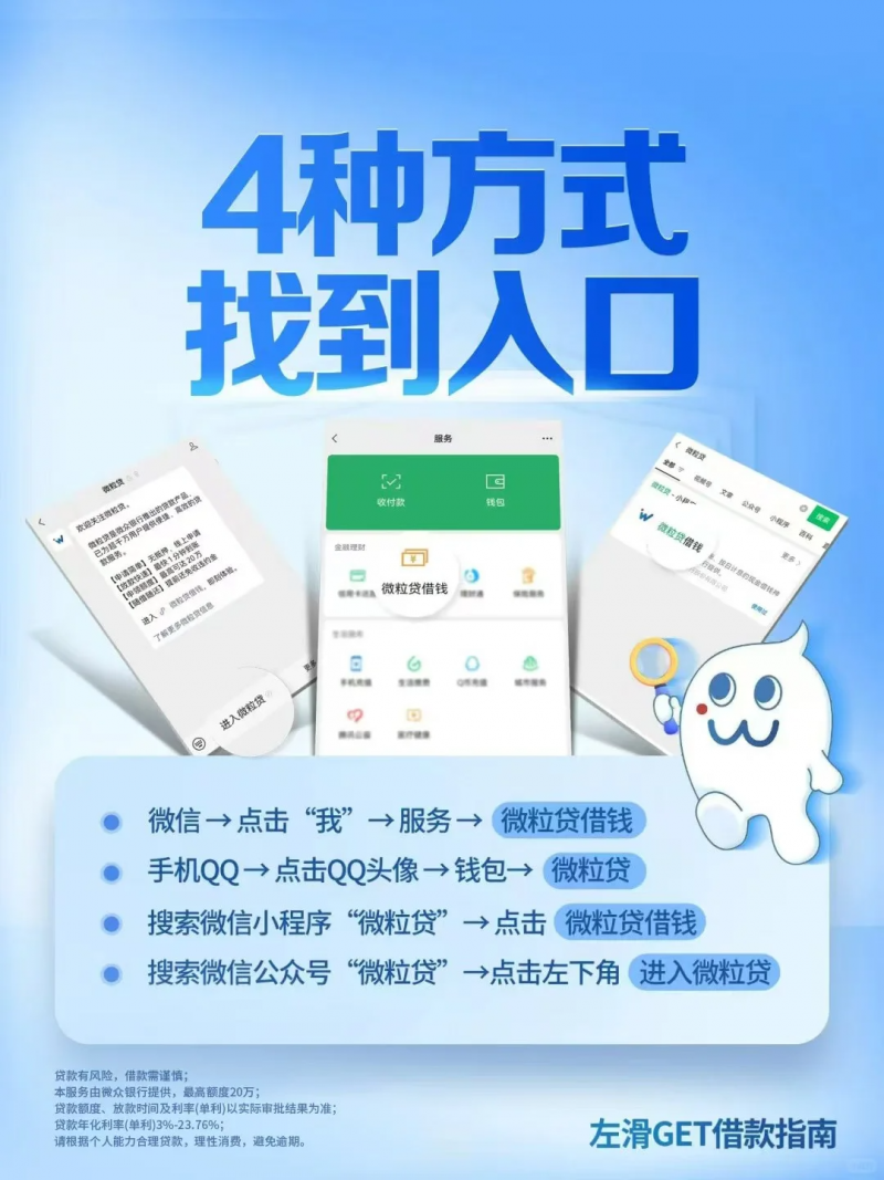 微粒贷是微众银行推出的小额贷款产品,主要面向23岁及以上人群,无需担保抵押,微粒贷的申请非常便捷,通过4种方式能找到入口: