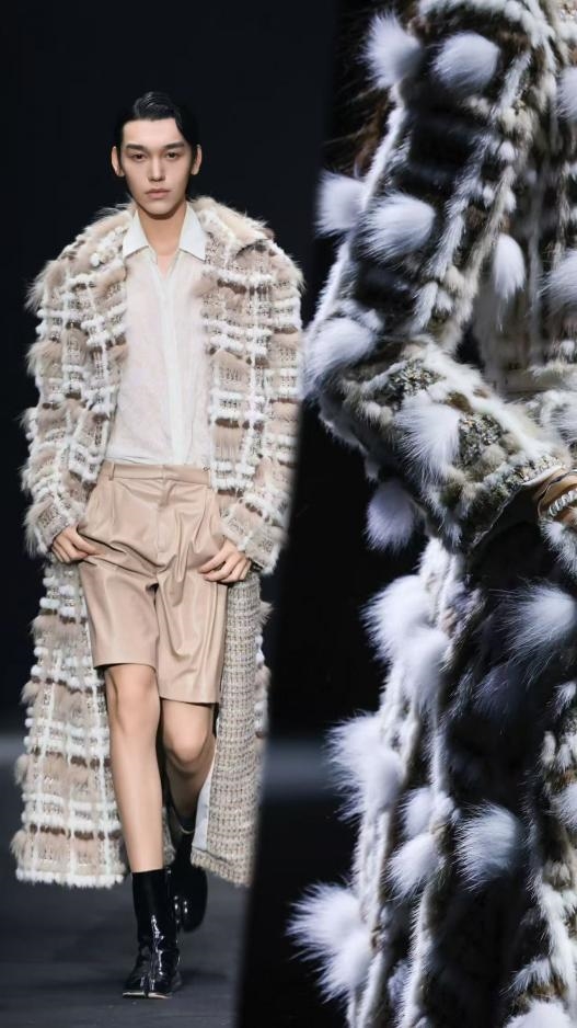 在细节打造上,秀场以象征蜕变与新生的“蝴蝶”为核心意象贯穿整体叙事。贾氏编织省级代表性传承人贾春红及团队在本次秀服打造中,通过精湛的钩针技艺将纱线与草编材料织成细碎的蝶翼鳞片,在模特的动态演绎下皮草绒毛与钩编蝶翼的轻摆与“共舞”,以丰富的律动感打破了服饰作为静态单品的呈现局限,为秀场叙事赋予了源自自然生命体的灵动感,静态的皮草服饰因而拥有了动态的生长质感。