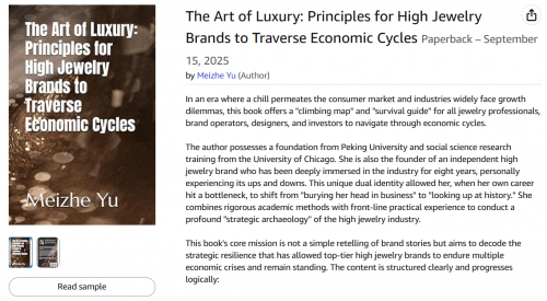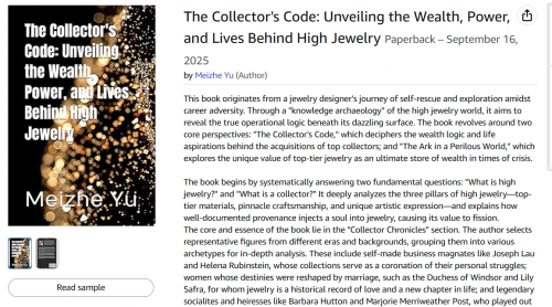 《奢华之道:高级珠宝品牌穿越周期的法则》(The Art of Luxury: Principles for High Jewelry Brands to Traverse Economic Cycles) 与《藏家密码:揭秘高级珠宝背后的财富、权谋与人生》(The Collector's Code: Unveiling the Wealth, Power, and Lives Behind High Jewelry) 现已在亚马逊 (Amazon) 全球站点上架,提供电子书 (Kindle) 与纸质平装书两种版本供读者选购。