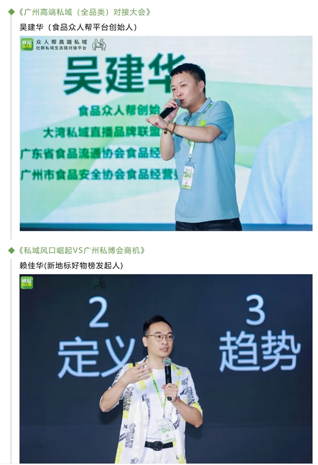 峰会以“‘百城千品万企’高端私域市场实战交流”为主题,邀请食品众人帮、群有料私域直播系统、新地标好物榜、银发家族、890人才银行等机构创始人担任分享嘉宾。